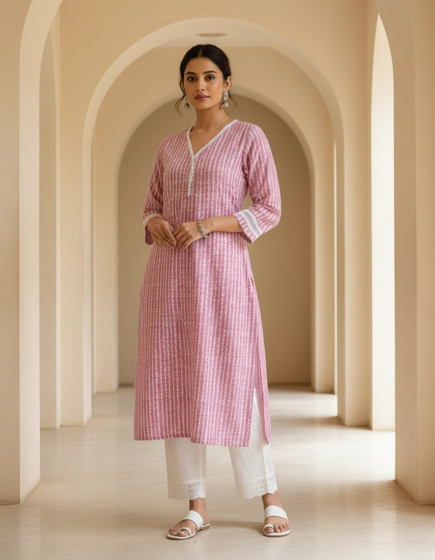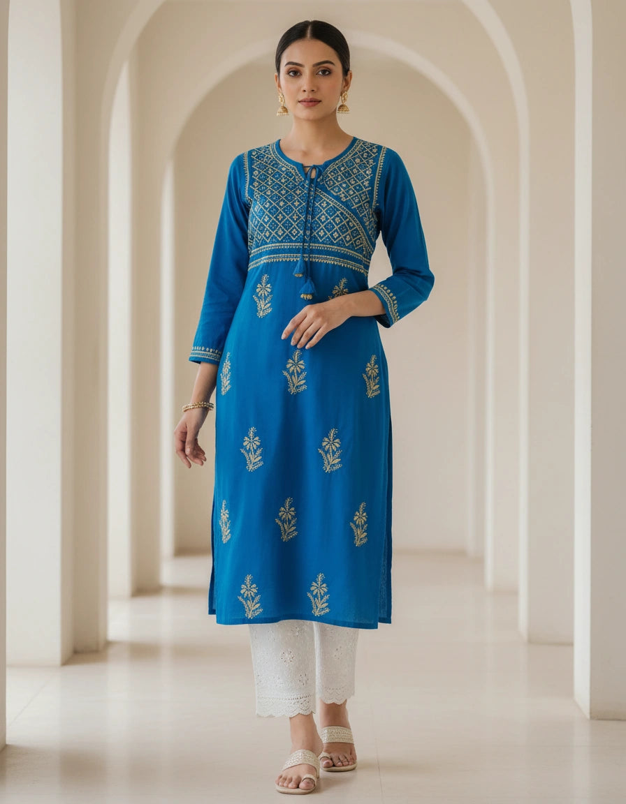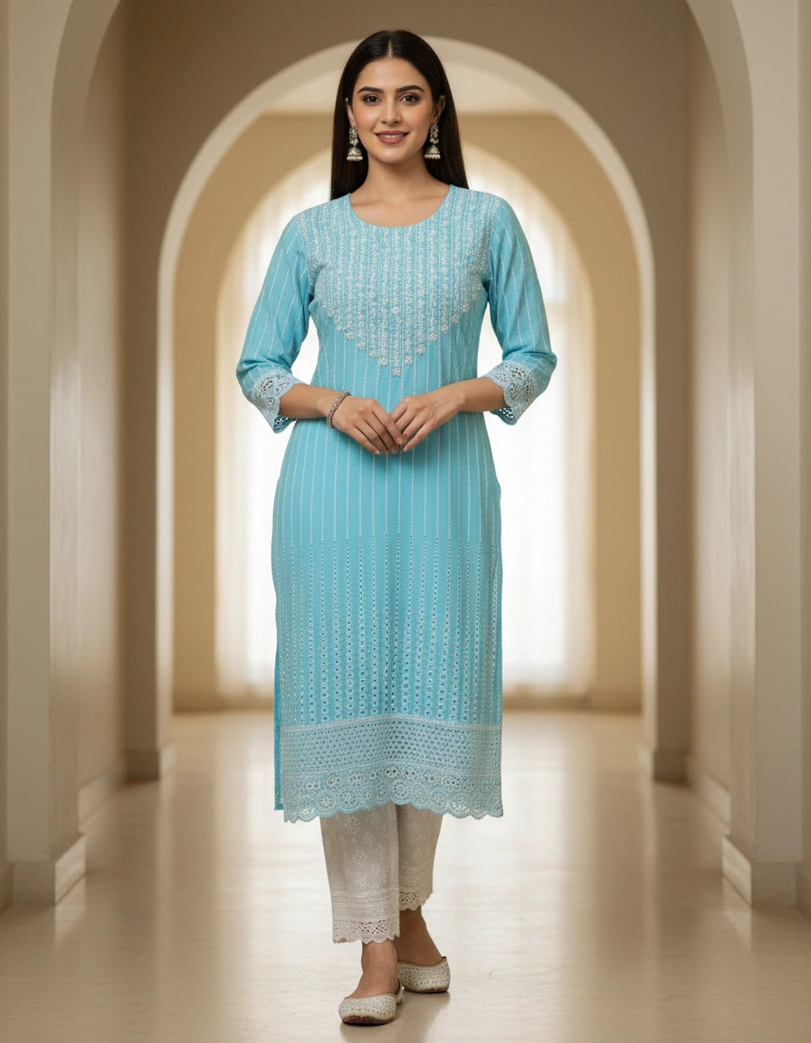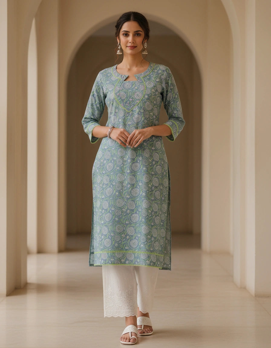 White And light blue Printed Modal Cotton Kurta With Pant Set -Custom Made