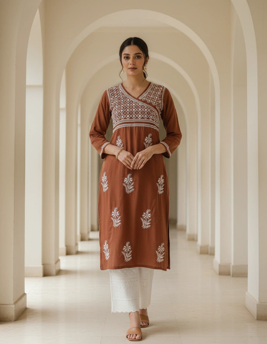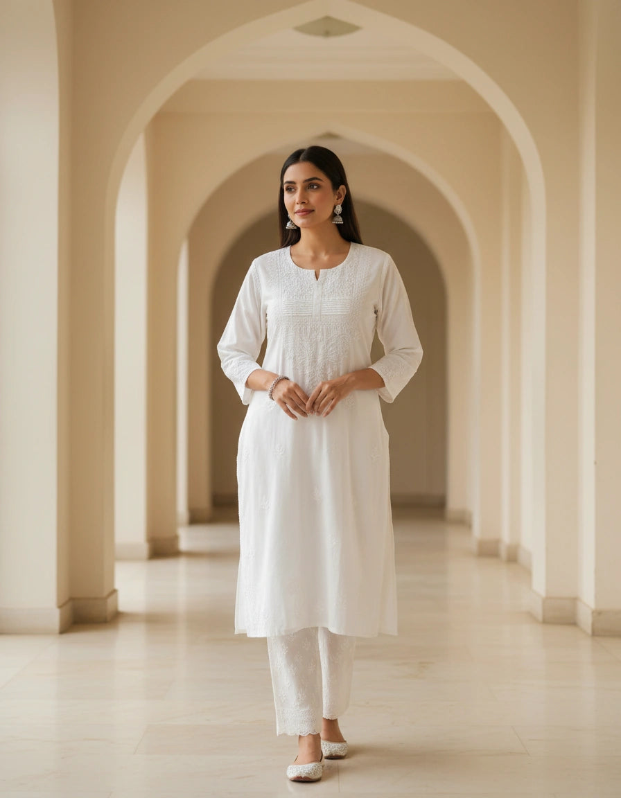 White Floral Printed Modal Cotton Kurta With Pant Set -Custom Made