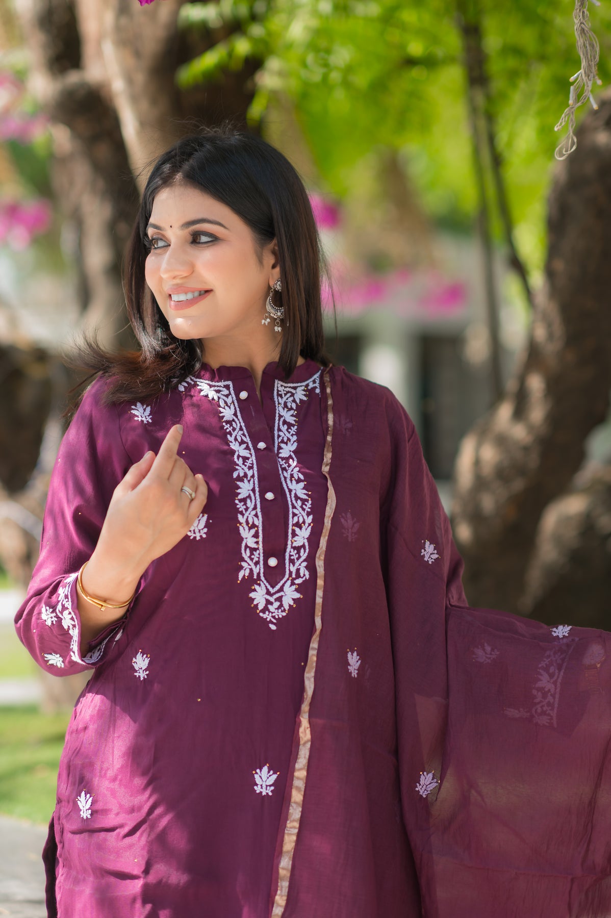 Wine Chanderi Chikankari Suit Set -Custom Made