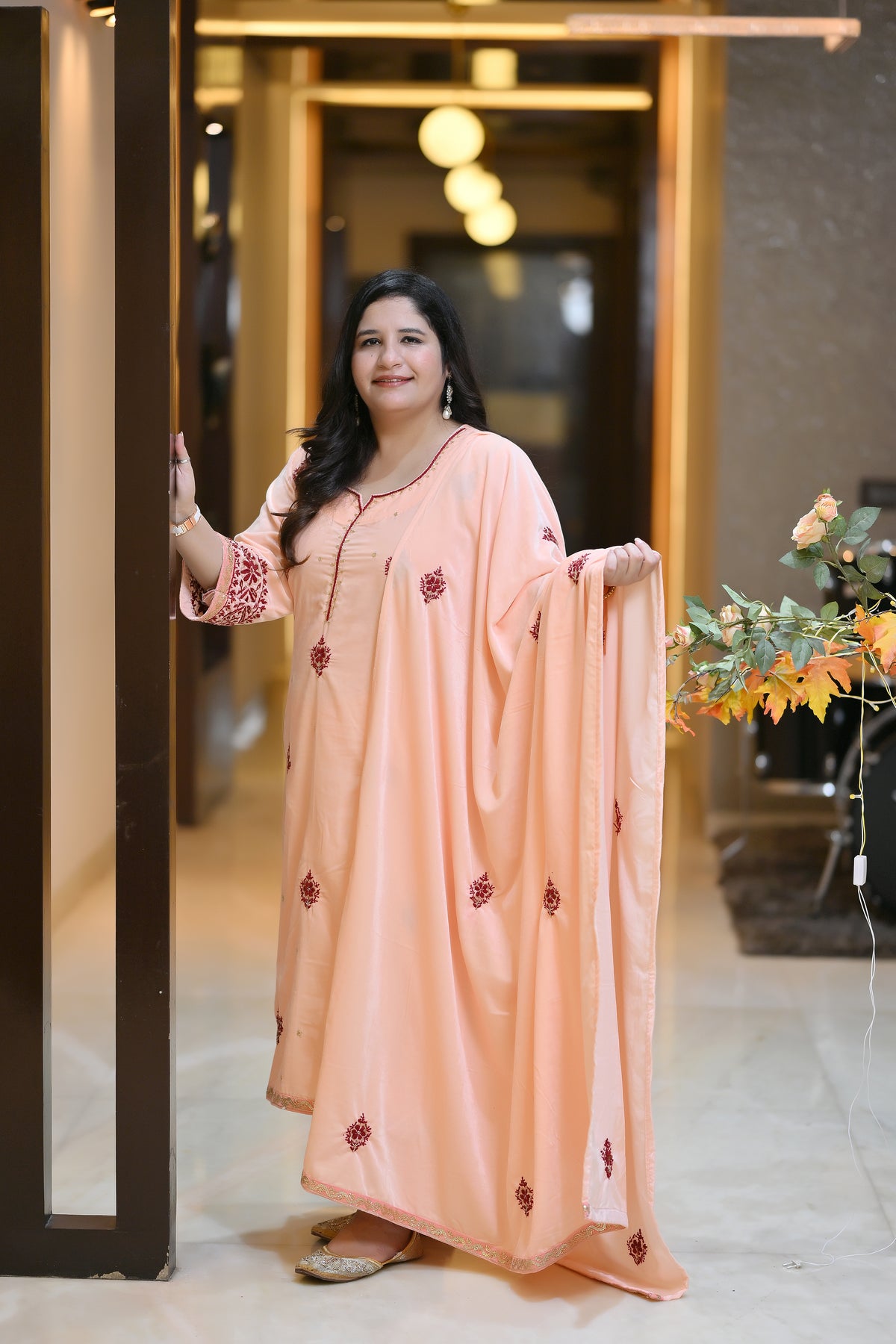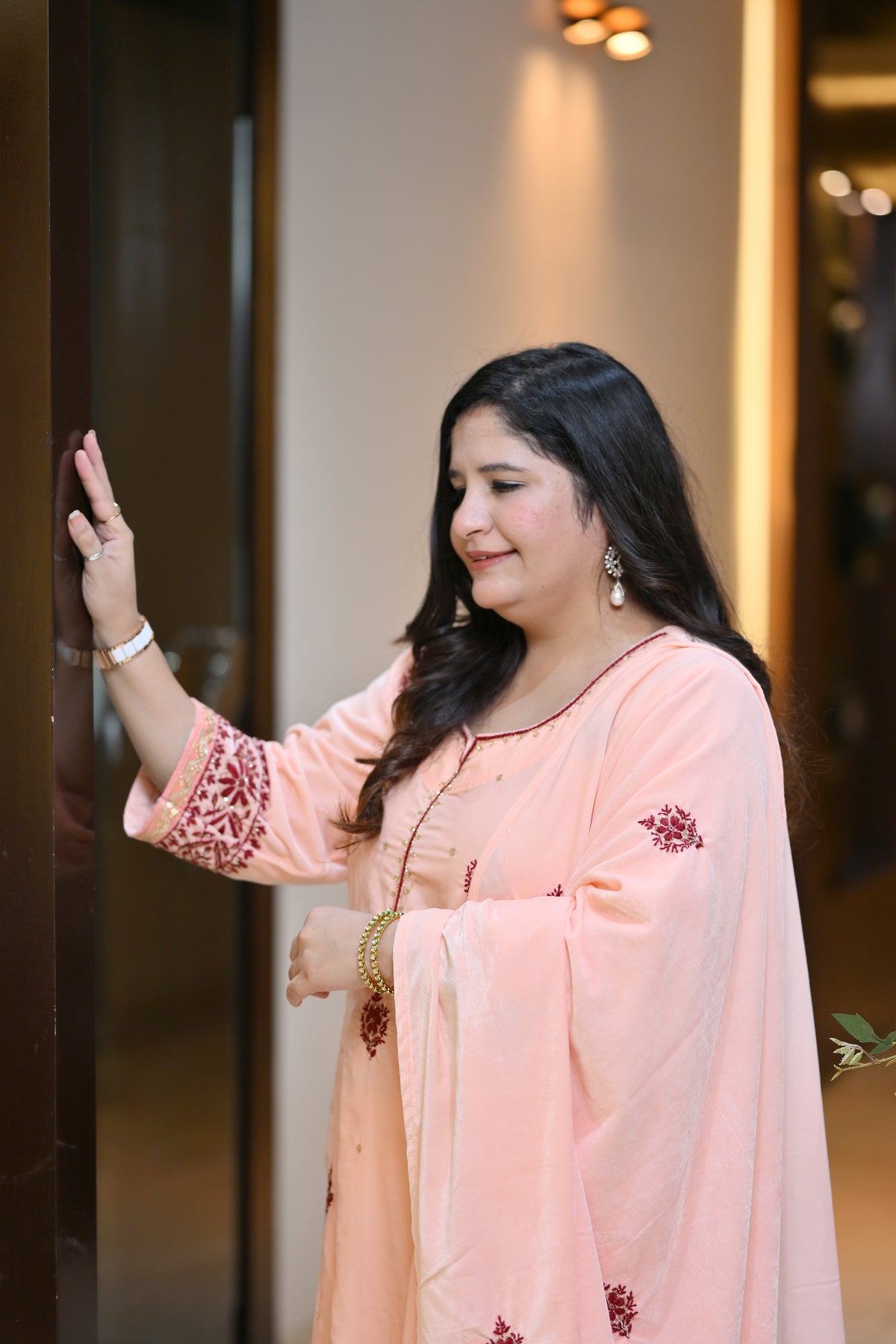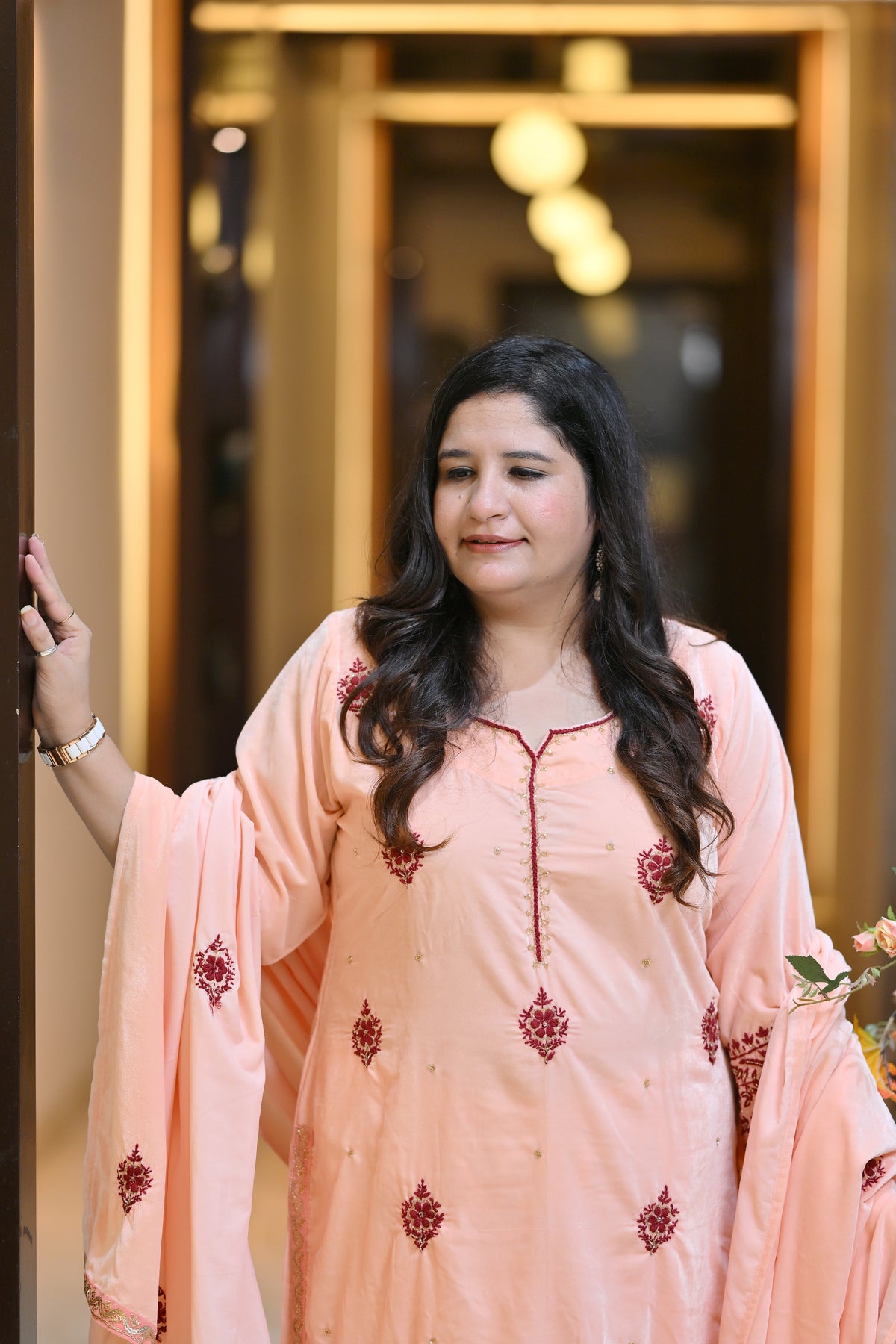 Light Peach Velvet Chikankari Suit Set - Custom Made