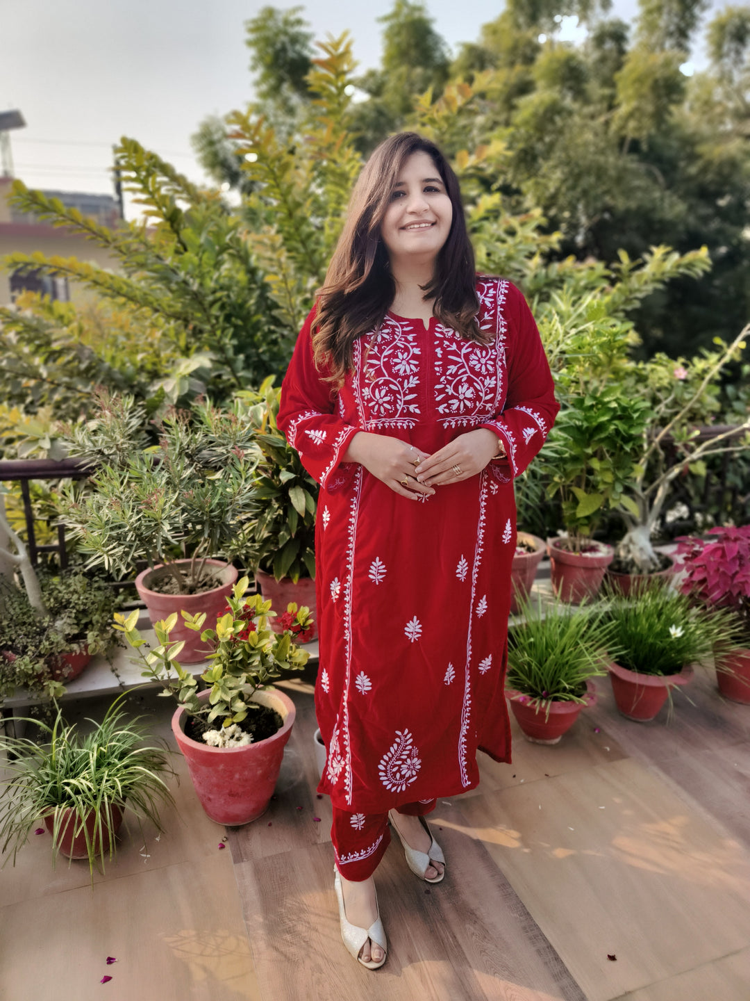 Red Velvet Chikankari kurta with Pant Set Custom-Made