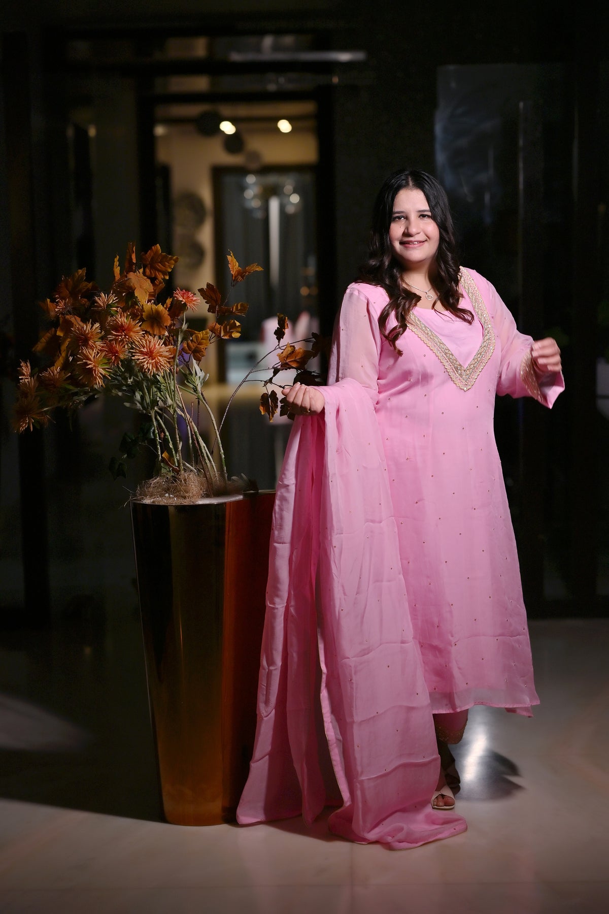 Baby Pink A-Line Hand Embroidered Suit Set-Custom Made