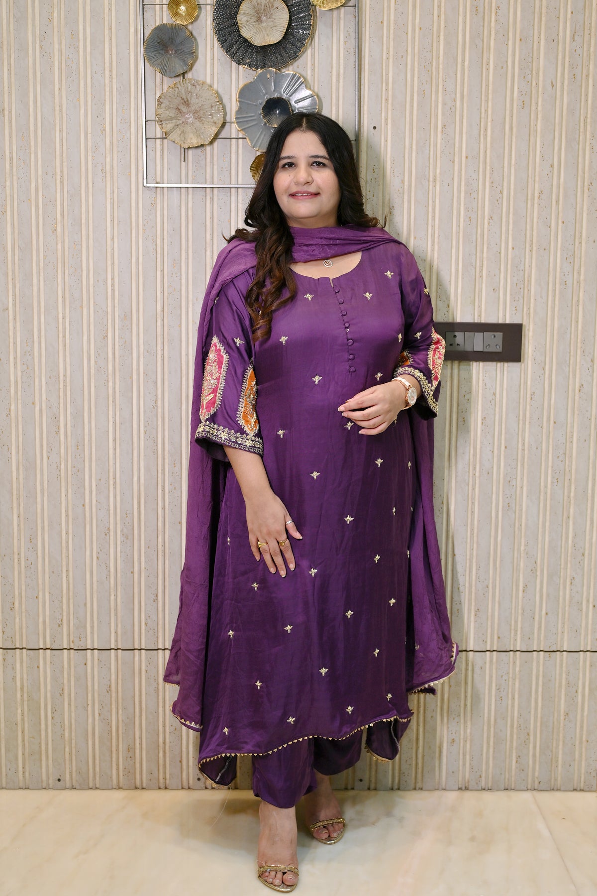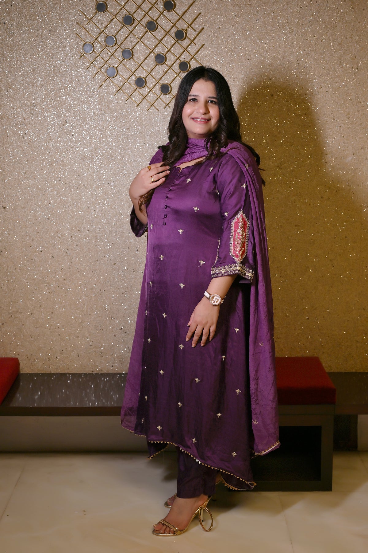 Wine A-Line Hand Embroidered Suit Set-Custom Made