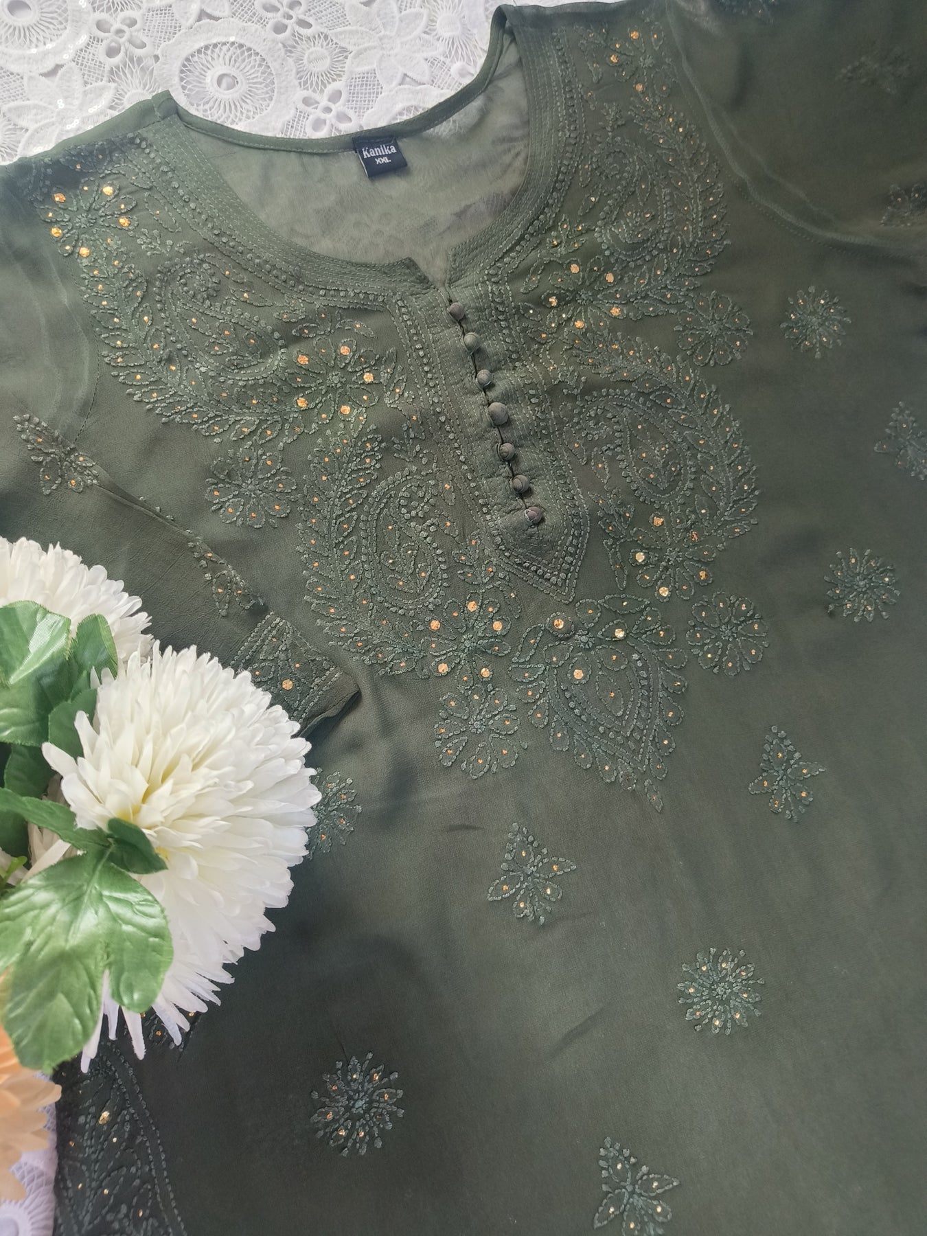 Olive green Georgette Chikankari Suit Set-Custom Made