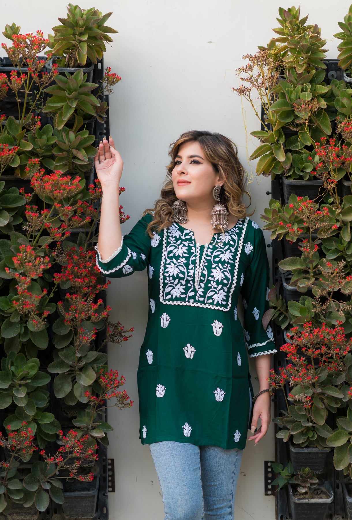 Dark Green Rayon Chikankari Short kurta -Custom Made