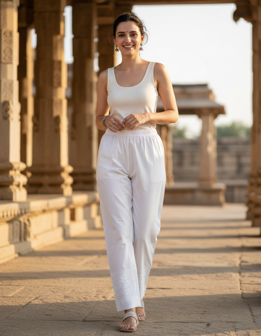 White Stretchable Cotton Chikankari Pant-Custom Made